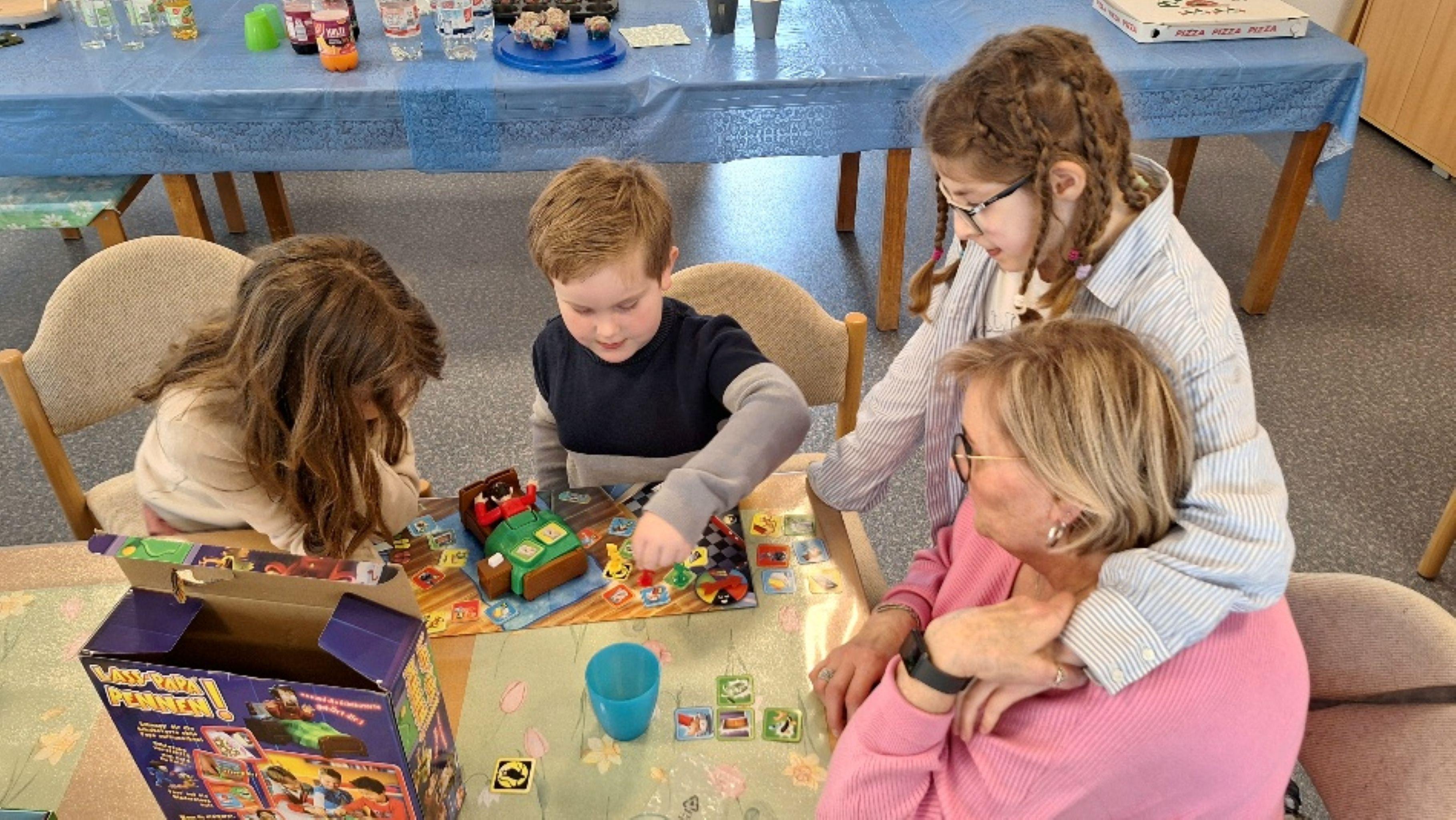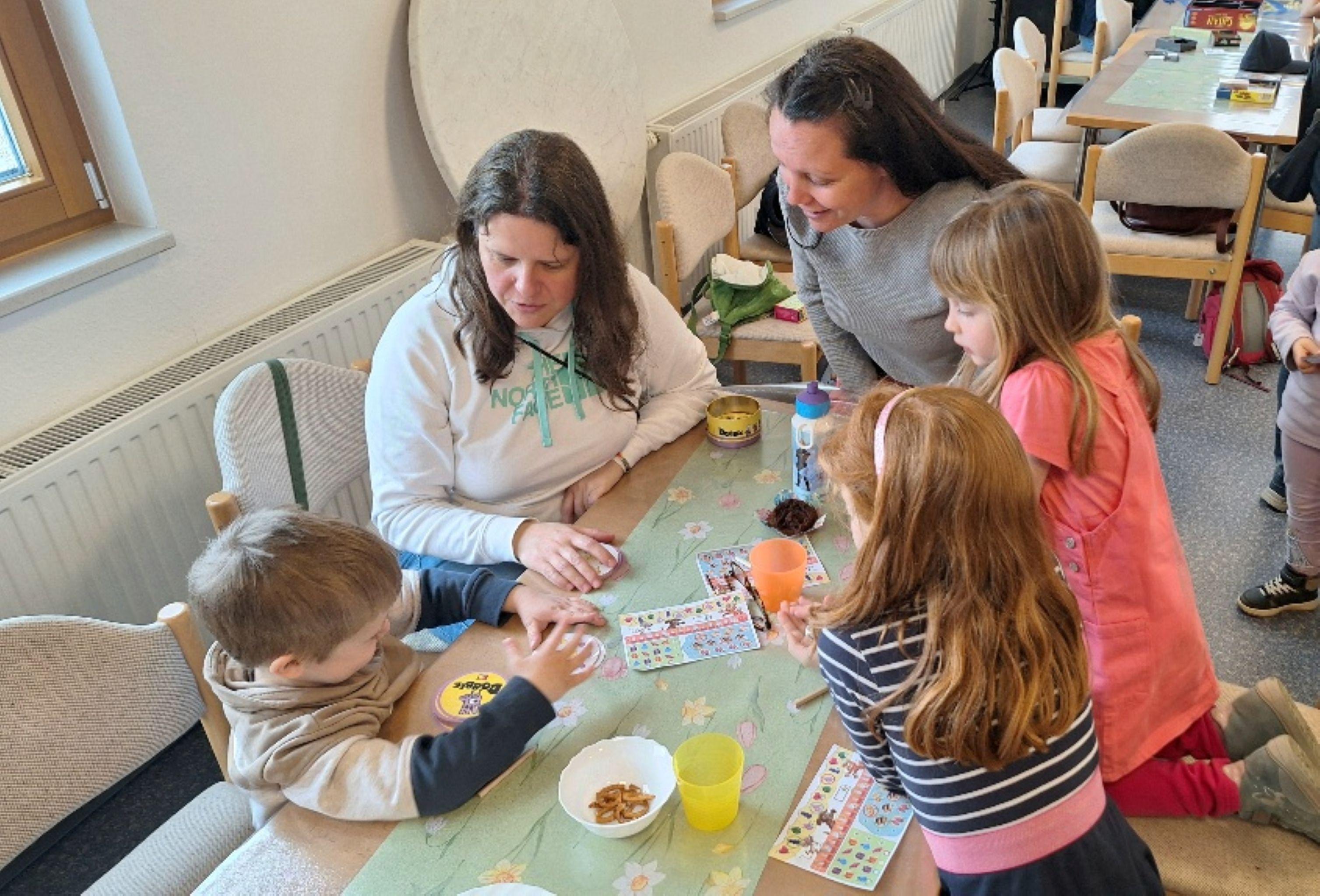 Nach der Vorstellung machte sich die Gruppe auf den Weg zur Kirche, wo bereits die Eltern warteten. Damit begann der zweite Teil des Tages: gemeinsames Ankommen, Essen, Spielen und Zeit für Gemeinschaft. Schnell wurden die mitgebrachten Lieblingsspiele ausgepackt und aufgebaut, und eine fröhliche, herzliche Atmosphäre erfüllte den Raum. Bei leckerer Pizza sowie bunten Muffins und Keksen wurde gemeinsam gespielt, geplaudert, gelacht und einfach Zeit miteinander genossen.